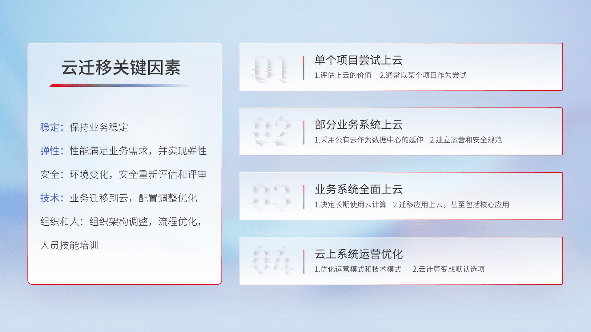 结合实际业务,,,从规划设计、、、、云平台选型、、、云原生改造、、、、数据迁移、、、集成交付,,,,迁移全过程为客户识别最佳上云路径,,,,做好风险识别管理,,,,设计网络架构、、、、身份权限、、安全审计合规、、、、操作审计、、、日志审计、、、监控告警策略、、、、多站点容灾设计等,,,,对云上基础设施进行整体规划,,提升IT治理水平,,,,以满足弹性、、高可用、、、、高性能的需求。。